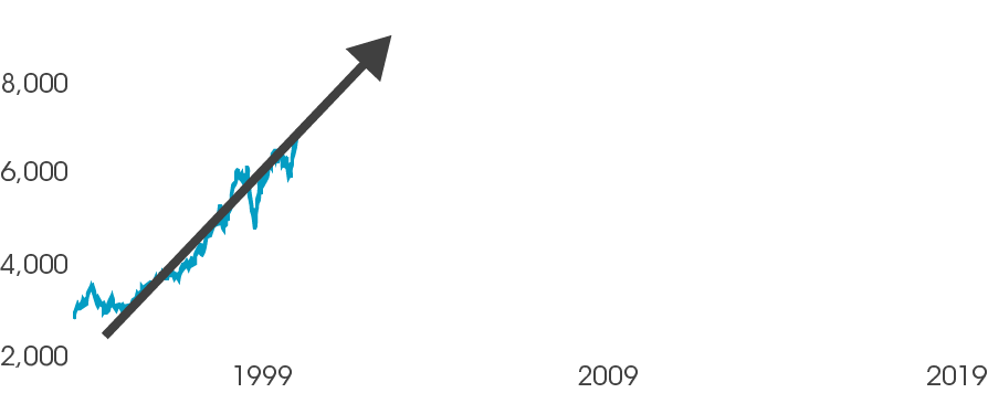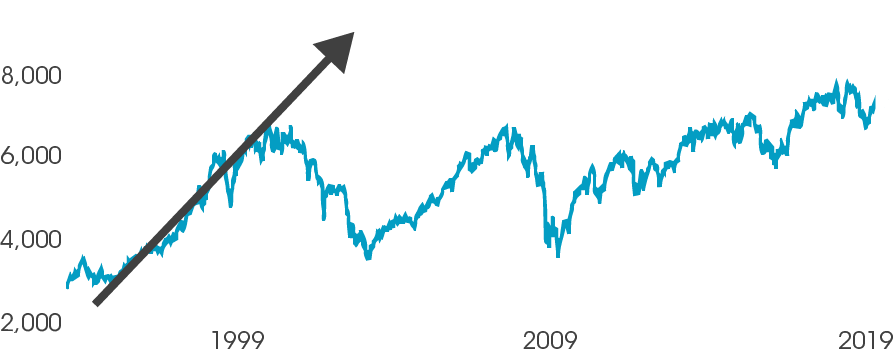 People presented with the graph above may naturally extrapolate the data as indicated by the purple line. However, this can now be considered a small data set. The ‘Law of Small Numbers’ means we naturally believe that the data in Figure 2 is common of the whole data set. However, if we look at the FTSE over the last 20 years, we can see this gradient was exceptional in that it was preceded by a relatively soft gradient and followed by a large dip. The heights indicated by the extrapolation have still not been reached, almost 19 years later.