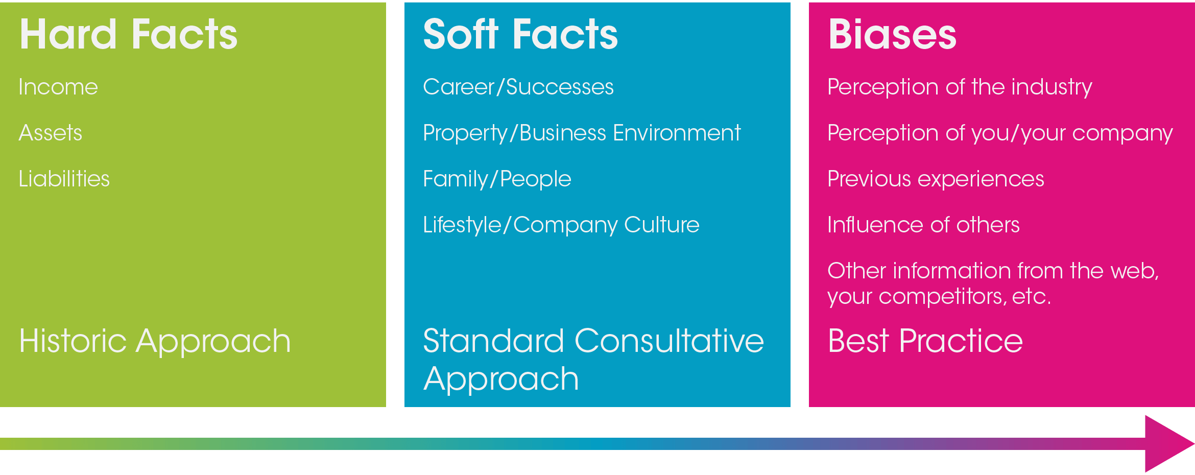 To challenge and co-create successfully you have to have a good relationship with the client based on trust. They have to know that when you contradict them you are doing it with the best of intentions because you want to help them chose the right product. Client trust is built on previous experience they have had with your service, your professional credentials and most importantly the way you interact with them.  How you build rapport and set the scene. How you deliver your Value Proposition, introduce yourself and explain the advice process, including introducing Behavioural Economics and preparing them for a Co-creative Sale. How you elicit the hard facts, soft facts and their biases and how you use this information to identify their particular needs and match these to the best product. If throughout this process you can build a trustful relationship, it becomes much easier to challenge respectfully and successfully when the need arises.