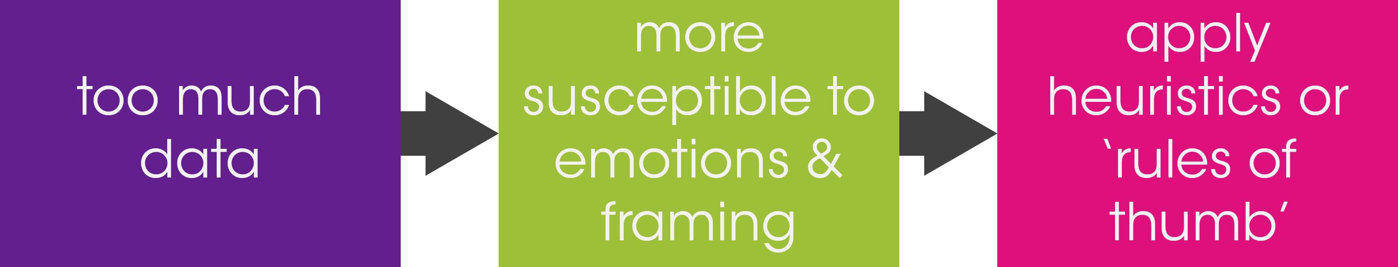 Behavioural Economics tells us that if we’re asked to analyse too much information at once, we abandon logic instead relying on previous ‘rules of thumb’ or heuristics. This is natural, but it can lead to a poor decision. So I hope you’ll allow me to challenge your thought processes and flag when I think you may be applying one of these heuristics, so we can analyse whether that option is really the best option for your company.